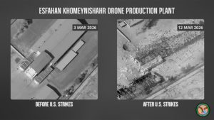 تُظهر الصورة المؤرخة في 3 مارس/اذار 2026 المصنع قبل تعرضه للضربات الأمريكية؛ في حين تُظهر الصورة الملتقطة في 12 مارس/اذار 2026 الموقع ذاته عقب تعرضه لوابل من الضربات الأمريكية بالأسلحة الدقيقة، مما يمثل ضربة قوية أخرى لقاعدة الصناعات الدفاعية الإيرانية.
